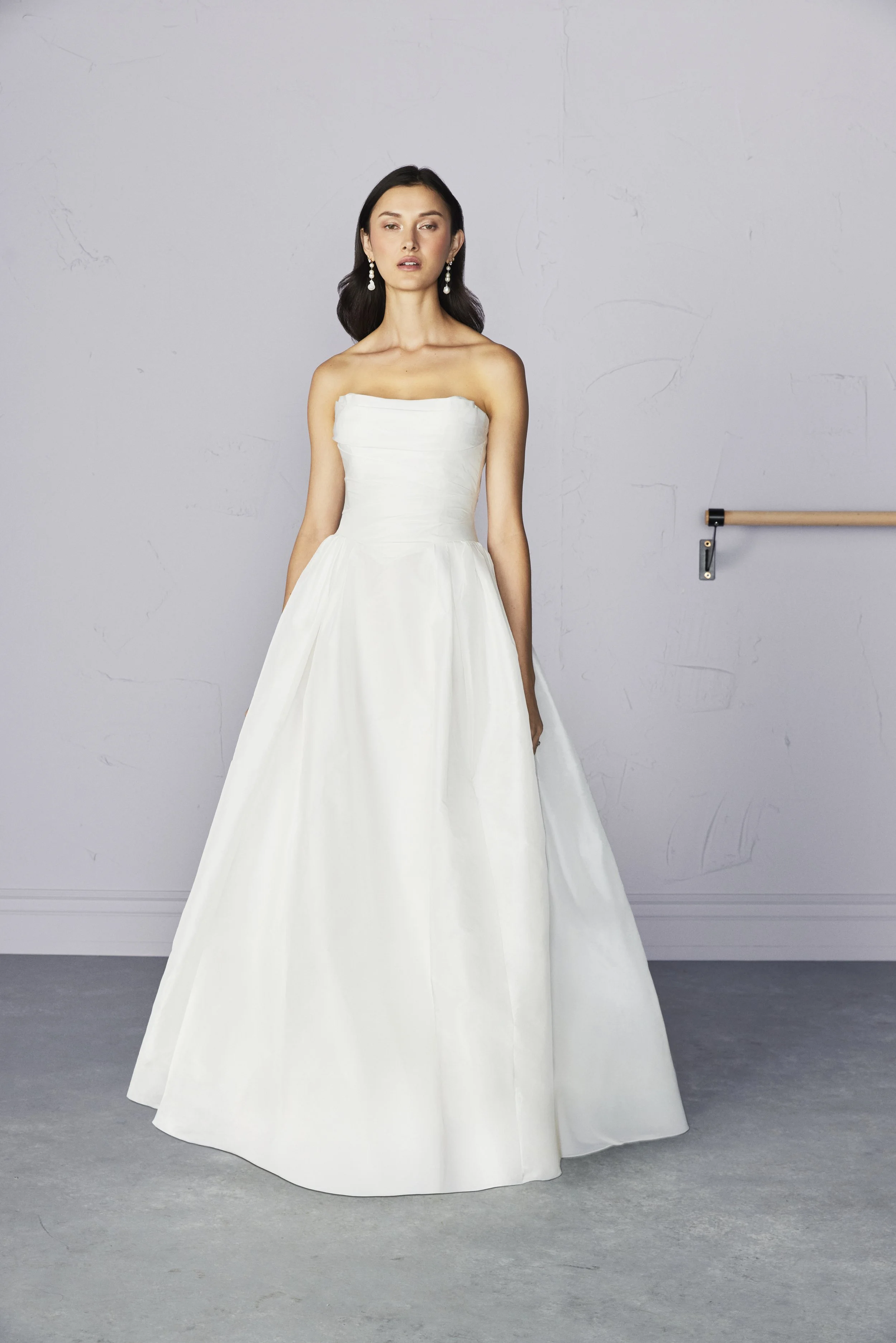 A recreation of the silk taffeta bespoke gown that was created for our bride, Ambar Driscoll. The Ambar features a strapless, corseted bodice with a gentle dropped basque waist and gathered fabric on the bodice that is draped under the bust to form a unique and flattering, textural silhouette. The lightweight billowing skirt can be hitched up and tied of inside to create uneven and dramatic pick-ups that form the sculptural and modern skirt. The back is finished with freshwater pearl buttons.